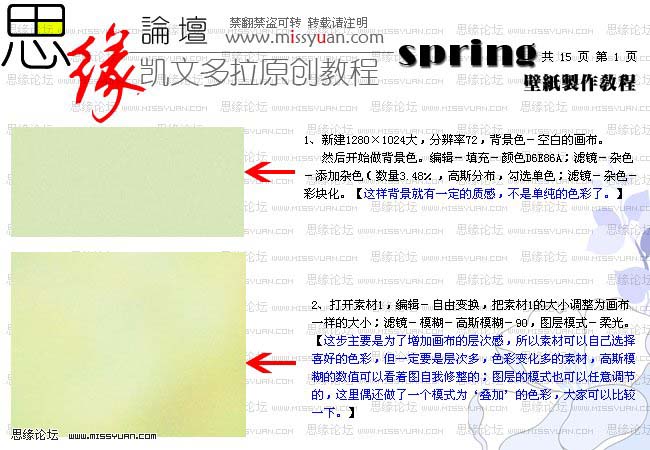 1、新建一个壁纸大小的文件,如1280 * 1024像素,分辨率为72,背景为白色。然后开始做背景色。执行:编辑 > 填充 > 颜色:D6e86a;执行:滤镜 > 杂色 > 彩块化。这样背景就有一定的质感,不是单纯的色彩了。