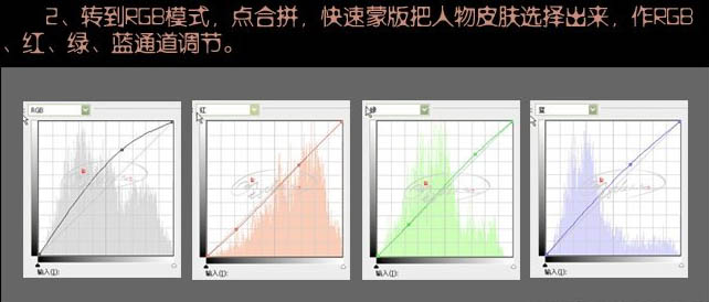 #p# 2、选择菜单:图像 > 模式 > RGB颜色,在弹出的窗口选择合拼,按字母“Q”,进入快速蒙版状态,用画笔把人物皮肤部分涂出来,然后按字母“Q”,推出快速蒙版,然后创建曲线调整图层,参数及效果如下图。