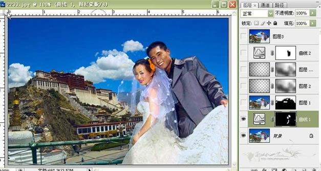 #p# 1、打开原图素材,选择菜单:图像 > 模式 > Lab颜色,然后创建曲线调整图层,对相应的三个通道进行调整,参数设置如下图。确定后用黑色画笔涂抹女主角裙子下方曝光过度的部位,效果如下图。