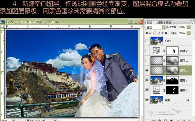 #p# 4、新建一个图层,选择渐变工具颜色设置为透明到黑色渐变,然后由中心向四周拉出径向渐变,再把图层混合模式改为“叠加”,加上图层蒙版用黑色画笔涂抹需要清晰的部位。