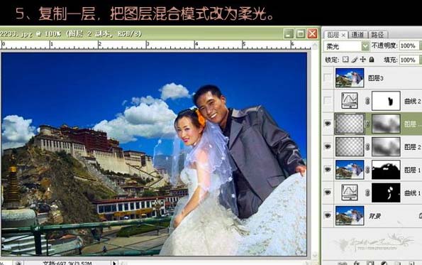 5、把渐变图层复制一层,图层混合模式改为“柔光”。