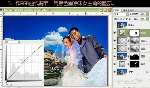 #p# 6、创建曲线调整图层,对RGB通道进行调整,参数设置如下图,确定后用黑色画笔涂抹女主角的脸部。