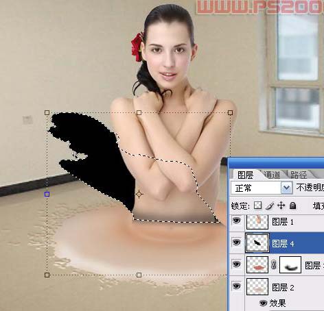 12、制作人物阴影,按Ctrl点人物图层调出选区,然后在人物图层下面新建一个图层填充黑色,按Ctrl + T适当的变形加上图层蒙版,再拉上黑白线性渐变,效果如下图。