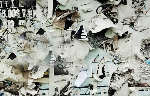2、把杂乱叠加的纸张素材拖入人物素材里,做为背景层,我们会发现纸张纹理素材不够在,不能扑满整个背景,我们把缺口补齐,如果素材不够可以多复制几分。