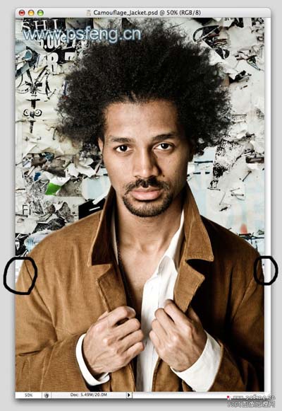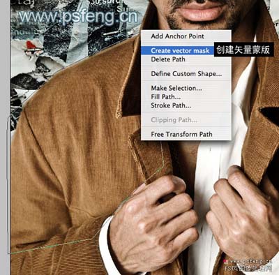 让我们首先左侧开始,复制纹理层。 然后移动位置到后面左侧的外套。 确保这层已被选中。 然后拿出钢笔工具勾出左则外套的一部分。 在用钢笔勾外套时尽量超过外套一点点,这样在我们用纹理拼贴时就不出现外套的边。