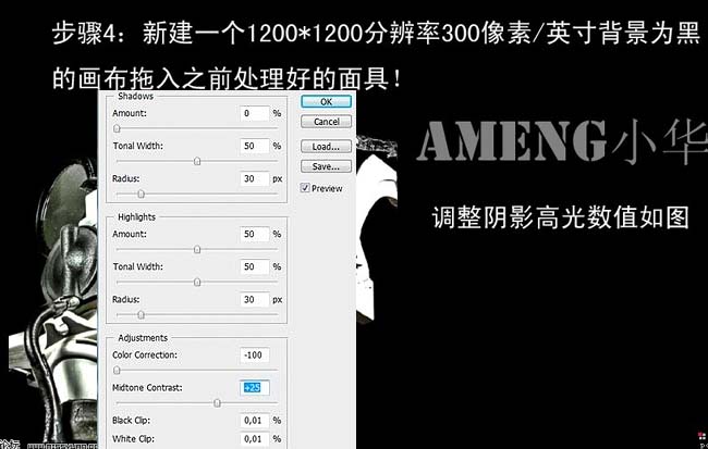 4、新建一个600 * 600像素(由于素材图有所压缩,新建的文件比作者的稍小)72像素的文件,背景填充黑色画布,投入之前处理好的面,执行:图像 > 调整 > 阴影/高光,参数设置如下图。