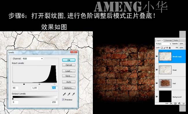 6、打开下图所示的裂纹图,按Ctrl + L调整下色阶,参数设置如下图,确定后把图层混合模式改为“正片叠底”,效果如下图。