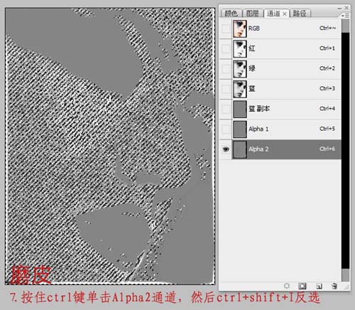 7、按住Ctrl键单击Alpha2通道,然后Ctrl + Shift + I 反选(或者执行菜单栏丽的选择—反向也一样的),这一步就选择了我们要磨皮的区域。