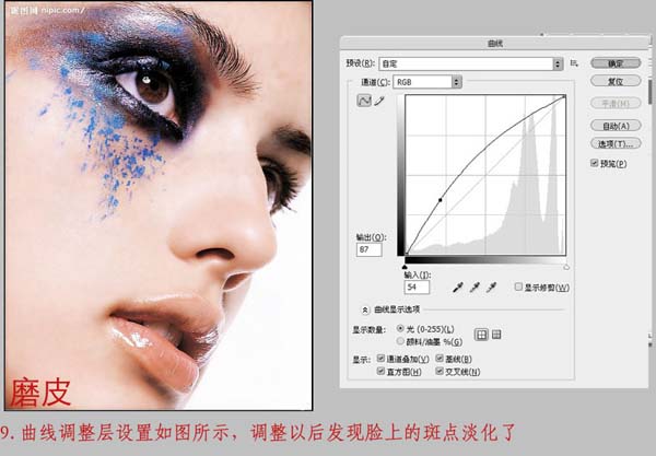 9、调整曲线,数值不要太大,人物脸上的斑点减弱了,第一步磨皮完成。