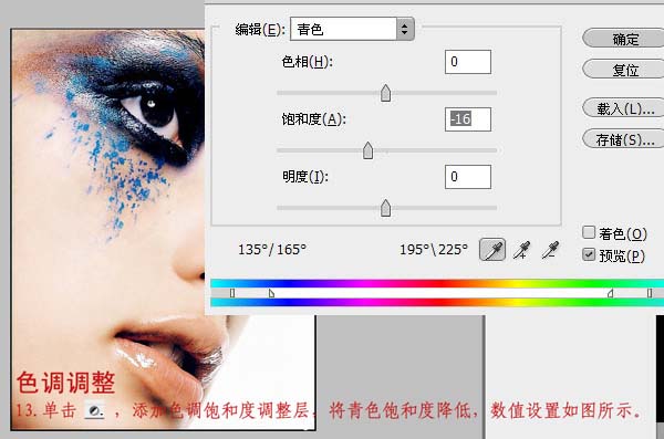 #p# 13、添加色相饱和度调整层,降低青色饱和度。