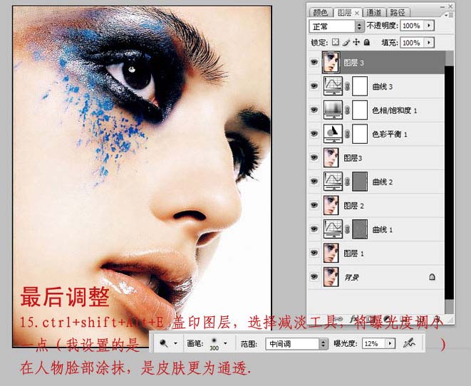 #p# 15、盖印图层,选择减淡工具对人物皮肤进行最后调整,这样可以是人物皮肤更为通透。
