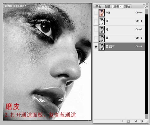 #p# 2、这里选择用法计算的方式磨皮,这种方法在改善人物肤质的同时可以保留大量的细节。将红、绿、蓝通道对比后,发现蓝通道人物脸上的斑点要明显些,因此我们复制蓝色通道,以便于更好的选择人物脸上的斑点和暗色区域。