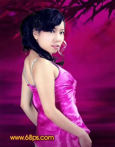 12、新建一个图层,填充颜色:#59023F,然后把图层混合模式改为“强光”,然后加上图层蒙版用黑色画笔把人物部分擦出来,效果如图23。