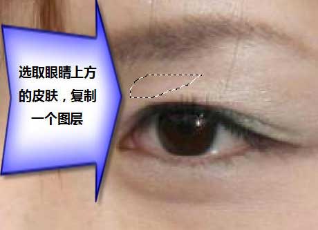 来源:网络 作者:不详 本教程的双眼皮及睫毛的添加不需要自己去画,而是从别的人物眼睛上复制过来,再调整好颜色和大小即可。 原图 最终效果   1、打开原图,把眼睛部分局部放大,用套索工具选取人物眼睛上方的皮肤,复制一个图层。 2、打开下图所示的人物