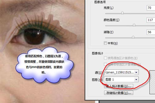 4、执行:图像 > 调整 > 匹配颜色,以图层1为源,慢慢调整,尽量是双眼皮内肤色与原人物肤色形同。