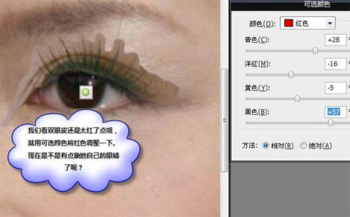 5、我们发现双眼皮还是太红了点,执行:图像 > 调整 > 可选颜色,参数设置如下图。