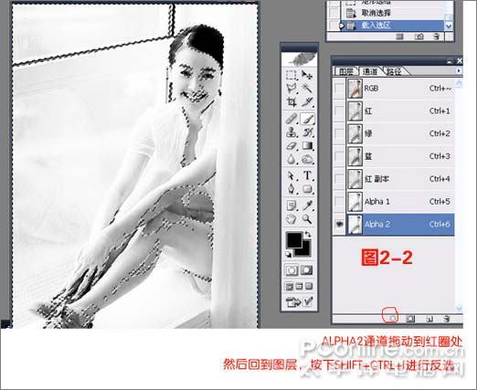 3、然后拖动ALPHA2拖动到“将通道做为选区载入”上,这时候屏幕上出现闪动的虚线;然后点图层,按SHIFT+CTRL+I进行反选。如图2-2: