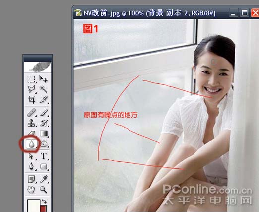 #p# 1、首先将原图在PS中打开,CTRL+J复制一层。(小贴士:初学朋友一定要养成这个习惯,尽量不要在加锁的“背景层”上操作。)然后选取模糊工具,强度60%上下,将MM的皮肤部分进行模糊处理,消除原图上的噪点,但要注意纹理,不要将皮肤原有的纹理涂掉,这样会使图片产生假的感觉,可随时调整模糊工具的强度。如图1: