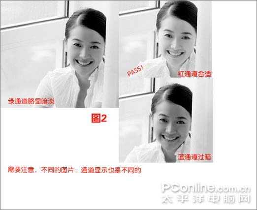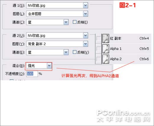 2、完成后点“通道”,仔细观察红蓝绿三个通道,看看在哪个通道下,原图上的MM皮肤会比较的通透,相对于这张图来说,红通道比较通透而不失真。然后将红通道复制一层,执行菜单—图像—计算,选“强光”然后将以上步骤再重复一次,得到图2-1: