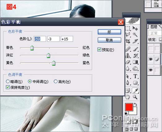 #p# 5、艺术化处理。在第3部完成以后,可以看到MM的皮肤通透了很多,也美白了不少,现在大家可以根据自己的喜好来添加艺术化效果,笔者这里选了自己喜欢的淡蓝色作为调整色,淡蓝色在视觉上也容易产生“通透”的效果,执行菜单—图像—调整—色彩平衡,选中间调,数值如下图: