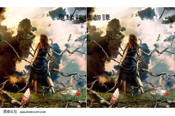 #p# 21、现在我们来添加一些近景的树根和花。如果你阅读了之前的所有步骤,那么接下来就容易多了。如前所说,选图是非常重要的,要求图片清晰度高,如果图片的分辨率低,那么制作出来的图效果将会很差。