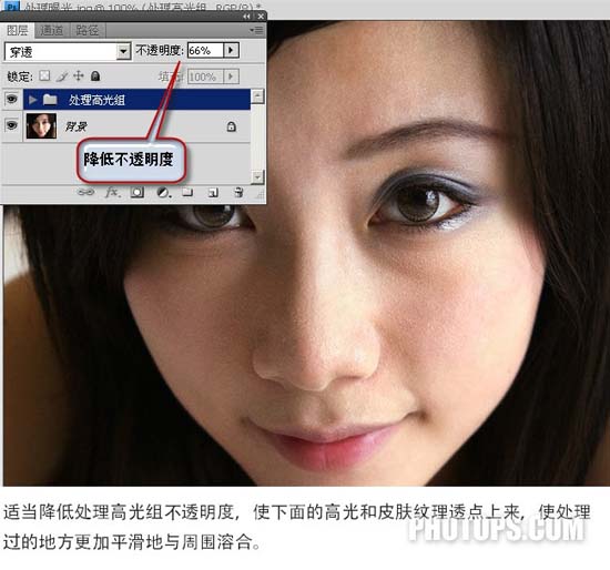 8、适当减低处理高光组不透明度,使下面的高光和皮肤纹理透点上来,让处理过的地方更加平滑地与周围融合。