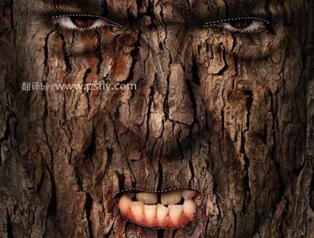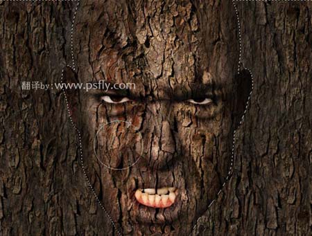 #p# 14、载入面部的选区,用画笔适当的擦出,使面部和树皮看起来有立体感。