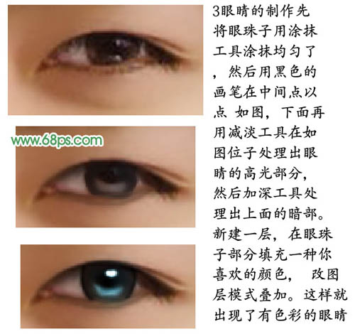 3、眼睛的制作,先将眼珠子用涂抹工具涂抹均匀了,然后用黑色画笔在中间点几点如图,下面再用减淡工具在如图位置处理出眼睛的高光部分,再用加深工具处理出上面的暗部。新建一层,在眼珠子部分填充一种你喜欢的颜色,把图层混合模式改为“颜色”,这样就出现了有色彩的眼睛。