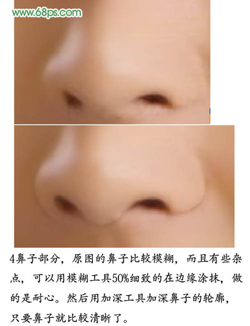 4、鼻子部分处理,原图的鼻子比较模糊,而且有些杂点,可以用模糊工具,压力为50%左右,仔细在边缘涂抹,做的是耐心。然后用加深工具加深鼻子的轮廓,这样鼻子就比较清晰了。