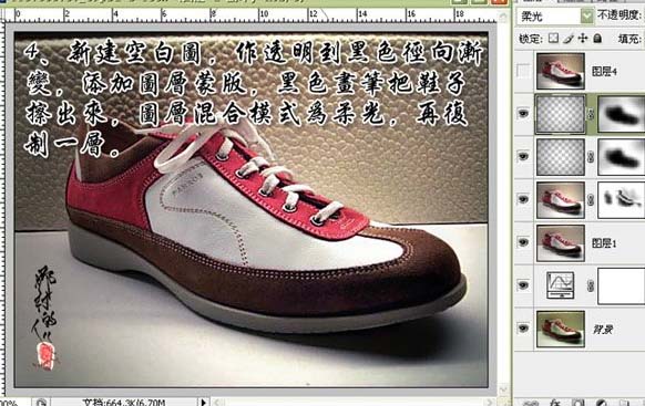 #p# 4、新建一个图层,选择渐变工具拉出透明到黑色径向渐变,添加图层蒙版,用黑色画笔把鞋子擦出来,再把图层混合模式改为“柔光”,然后再复制一份。