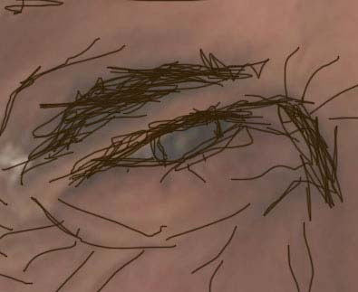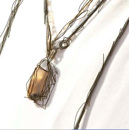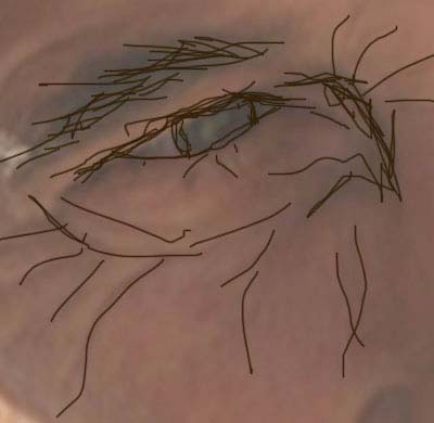 2、得到一个合适的图像大小后,创建一个新层取名"素描线稿"层,选择画笔工具,使用一种深棕色,画笔大小为2像素,不透明度为100,再将原始图像透明度降低到75%,这样你可以看到一个清楚的线稿. 现在回到"素描线稿"层使用画笔在图层上粗略的画出一些线稿,这里运用的技巧很简单直观,用画笔大概的建立起图像.如果你有一些线稿弄得有些糟先不要删掉它,这有助于我们正在努力创建的艺术效果,注意沿着原图像的纹理来画,比如,沿着头发与眼睛可以随着纹理随机性的画一些线条,有一个好的窍门就是按住鼠标左键不放在同一地方重复来回的涂画,而不是用鼠标点击一下再画一下,下面的图中你可以看到这一过程中不同阶段的效果。