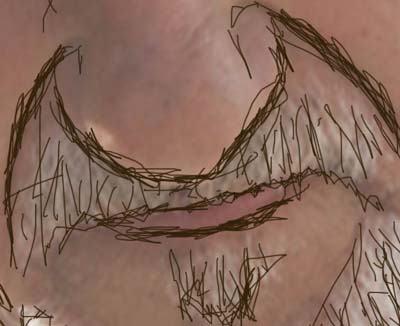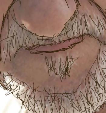 现在你需要给予线稿一些变化.更好的捕捉到人物的阴影部分,要做到这一点,你需要把图像原大显示,使用画笔沿着图像的阴影部分画出线条,看起来要像是线条覆盖了图像的阴影部分.当然这些操作依然要在"素描线稿"图层上执行。