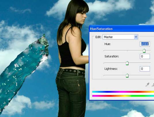11、现在让我们来创造一些水螺旋。这一次,我们将使水从软管下降。选中它并粘贴在我们的形象。现在转到图像“调整”色相/饱和度和变化的色调设置为111。