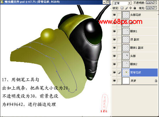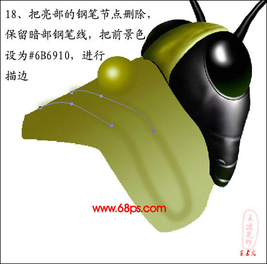 18、把亮部的钢笔细节点删除,保留暗部钢笔线,把前景色设为:#6B6910,进行描边。