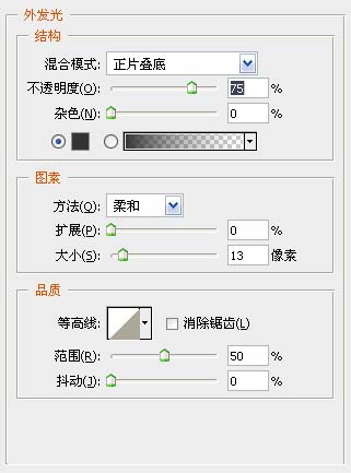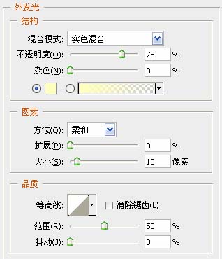 64、到这里,烟民已经把文字层全部合并了,并且加了一个外发光效果,设置如下: