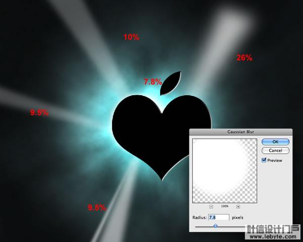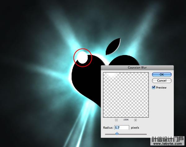 #p# 9、用椭圆工具,建立一个小的圆形放在LOGO前面,用此来制作光线效果。同样利用模糊。