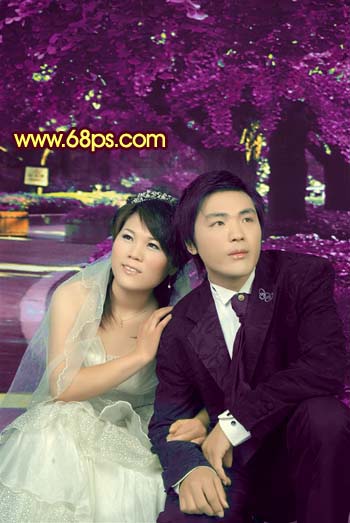本教程介绍金色婚片的调色方法。主体部分是背景的制作,需要用滤镜加点梦幻效果,然后调成斑斓的金色调。然后再单独对人物调色。制作的小步骤比较多,需要注意好整体色调协调。