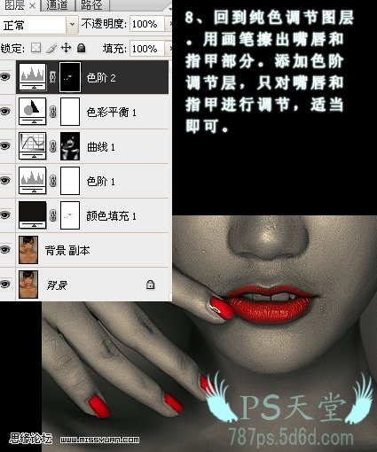 8、回到出色调节图层,用画笔擦出嘴唇和指甲部分。创建色阶调整图层只对嘴唇和指甲进行调节(可以先整体调节,再用黑色黑白把其他部分擦掉即可),主要是调节指甲及口红颜色,自己满意即可。