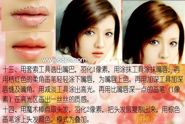 13、用套索工具选出嘴巴,羽化1像素,用涂抹工具涂抹嘴唇,再用桔红色的柔角画笔轻轻涂下嘴唇,为嘴唇上色。再用加深工具加深唇红及嘴角。用减淡工具涂出高光。再用比嘴唇深一点的画笔(1像素)在高光区画出一丝丝的质感。