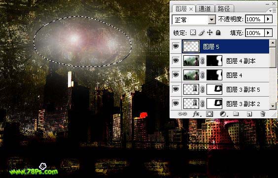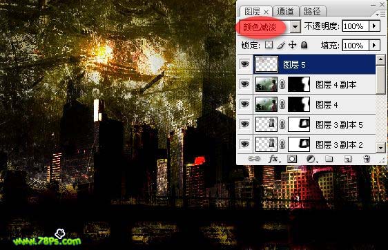 本教程合成效果有点另类。整个画面光线比较暗,在散乱的纹理下透露出绚丽的都市灯光。给人一种压力凄凉的感觉。估计这也是作者特意想表达的设计意图。制作的过程中用到的素材比较多,处理的时候需要注意好整体颜色的调整和细节的处理。