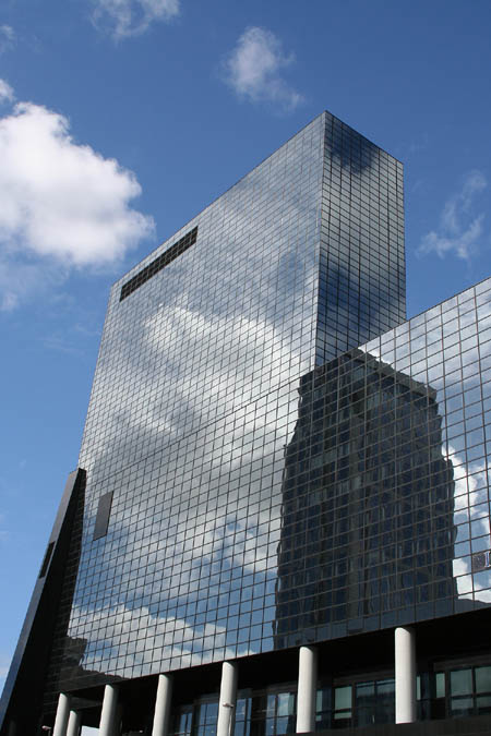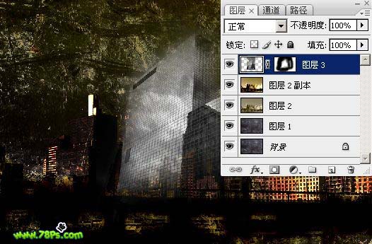 11、为高楼大厦添加蒙版,用画笔工具在蒙版上涂抹出以下效果。