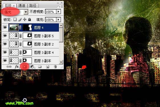 15、拖进高楼大厦的图层上面,按CTRL+T调整合适大小。模式设置为强光,添加蒙版,用黑色画笔工具在蒙版上涂抹出以下效果。