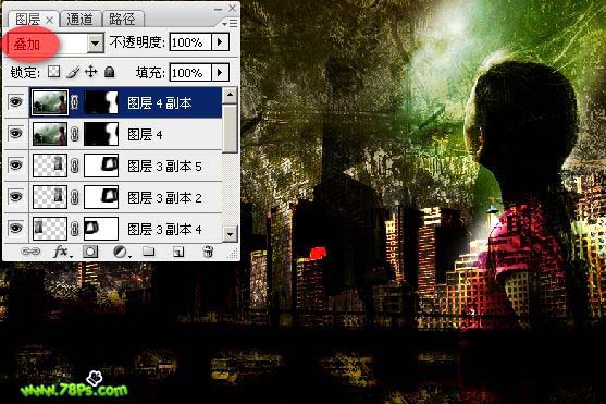 4、设置城市素材图层的混合模式为亮光,你会看到这样的效果。