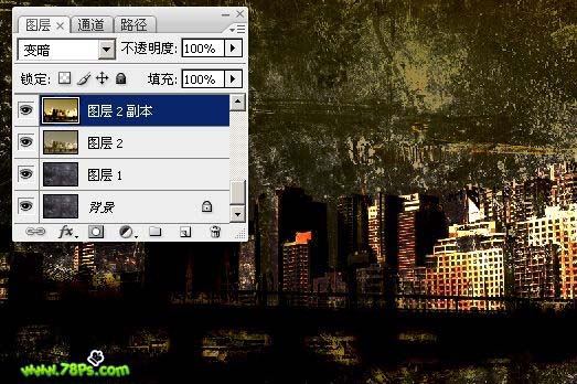 #p# 8、复制一层城市图层,对该图层执行高斯模糊7像素(滤镜--模糊--高斯模糊),然后我们再次复制这个模糊后的城市图层,把这2个复制的图层合并为一个图层,得到一个图层2副本,模式为变暗。