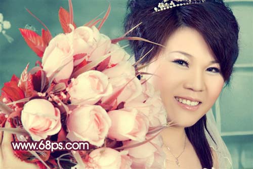 1、打开原图素材,创建色相/饱和度调整图层,参数设置如图1,勾选着色选项,确定后用黑色画笔把人物及花朵部分擦出来,效果