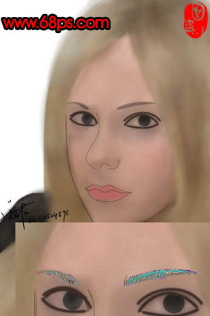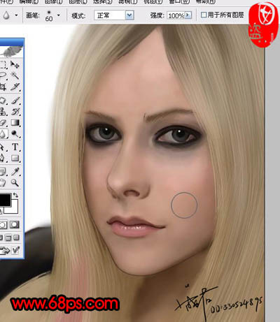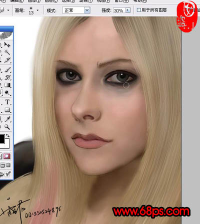 #p# 11、涂沫工具,强度为30%,顺着眼睛的走向打小圈的轻涂,目的是要让皮肤更融洽。鼻子和嘴都是一样的作法。