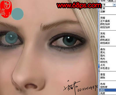 16、改变眼珠颜色的方法有很多种,在这说一种大家可能比较少做的。画出一个圆,填充蓝色,放在眼珠位置,图层样式改为“颜色”,把超出眼珠部分的擦掉,改小透明度。