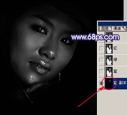 3、按住Ctrl键,然后点图层面板蓝副本缩略图如下图红圈位置,调出高光选区。