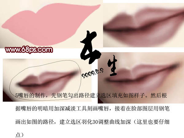 5、嘴唇的制作,先用钢笔勾出路径建立选区填充如图样子。然后根据嘴唇的明暗用加深/减淡工具刻画嘴唇,接着在脸部图层用钢笔工具画出如图路径,建立选区羽化30像素,再调整曲线加深(这里要仔细点)。
