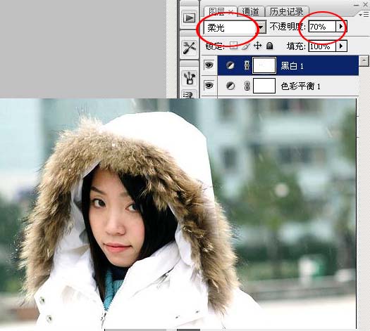#p# 6、此刻的照片看上去非常奇怪,不要着急,让我们把混合模式改成“柔光”,并且将不透明度降低到70% (看情况而定)